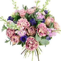 This sophisticated bouquet, masterfully arranged by a dedicated Redbridge florist, brings together an orchestra of hues and textures set against a pure white background. Voluminous hydrangea blooms in shifting shades of indigo, teal, and muted amethyst offer a visual anchor reminiscent of the deep tones found in Redbridge's tranquil parks and vibrant gardens. Sweeping through the bouquet, roses in soft lavender and creamy white unfurl with poise, their petals each a testament to classic romance and gentle beauty. White ranunculus, characteristically multi-layered and plush, add both contrast and allure, while pale yellow lisianthus buds and partially opened flowers thread throughout-signalling renewal, much like the blossoming trees on Cranbrook Road in spring. Sprays of hot pink filler blooms and feathery light pink astilbe plumes dance around the bouquet's edges, introducing buoyancy and energy so typical of Redbridge's community spirit. Airy, lacy filler flowers in green and white provide delicate intricacy; together with deep green foliage, they lend visual texture and a sense of lushness. Tightly gathered, the stems are elegantly wrapped with a wide, gleaming satin ribbon in royal purple-a detail that ties the composition together while nodding to local sophistication. This bouquet perfectly suits special occasions, heartfelt congratulations, or simply adding a touch of Redbridge's floral artistry to any space-expressing care, joy, and refinement in every petal.
