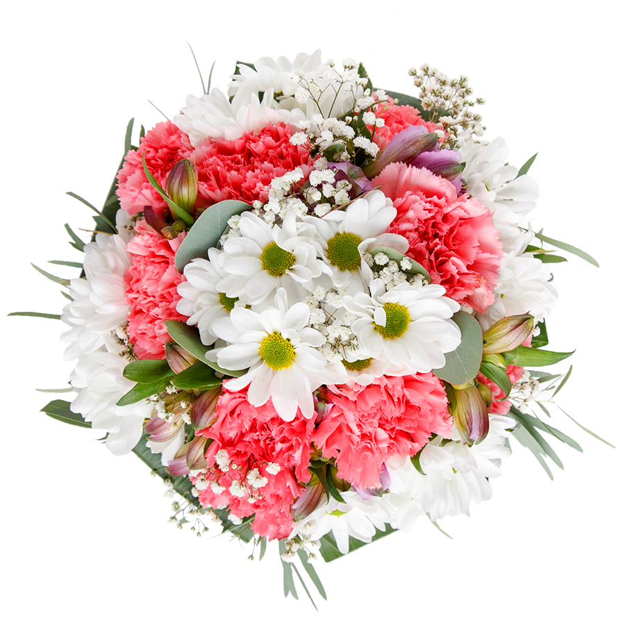 Delight in the grace and uniqueness of our handcrafted flower arrangement. This exquisite bouquet showcases a soft palette with snow-white chrysanthemums, ethereal gypsophila, and charming light pink carnations, elegantly wrapped in vibrant aspidistra leaves.
